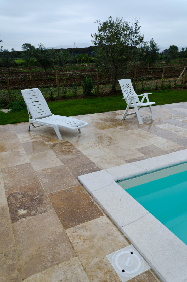 La scelta è ricaduta sul travertino Terra Chiara (codice PDR013), una selezione luminosa nei colori tipici della campagna toscana, impiegato per il porticato coperto e per la zona nei pressi della piscina.