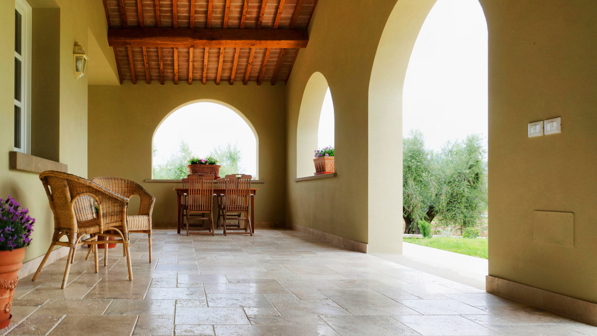In particolare all’esterno, si è cercato un materiale che dialogasse con la facciata in ocra chiara e le capriate in legno per caratterizzare e definire le logge esterne alla villa.