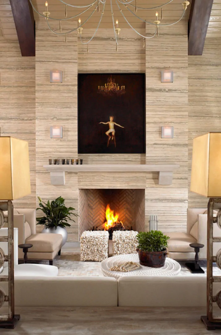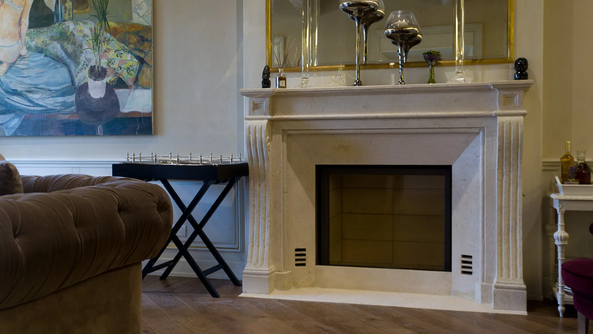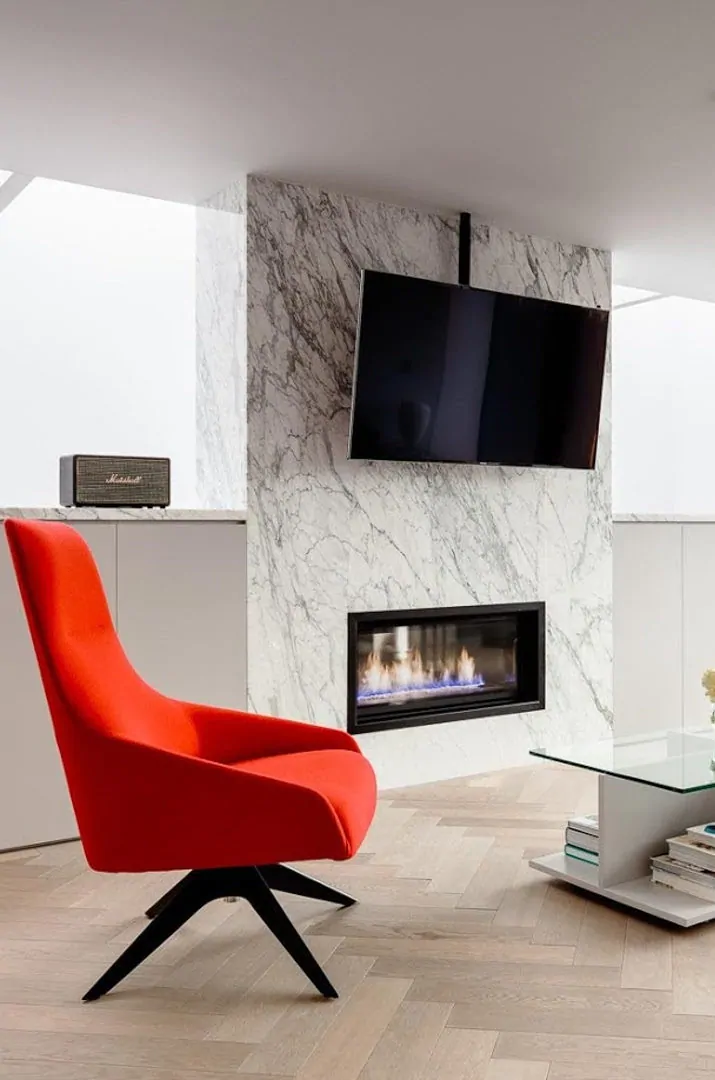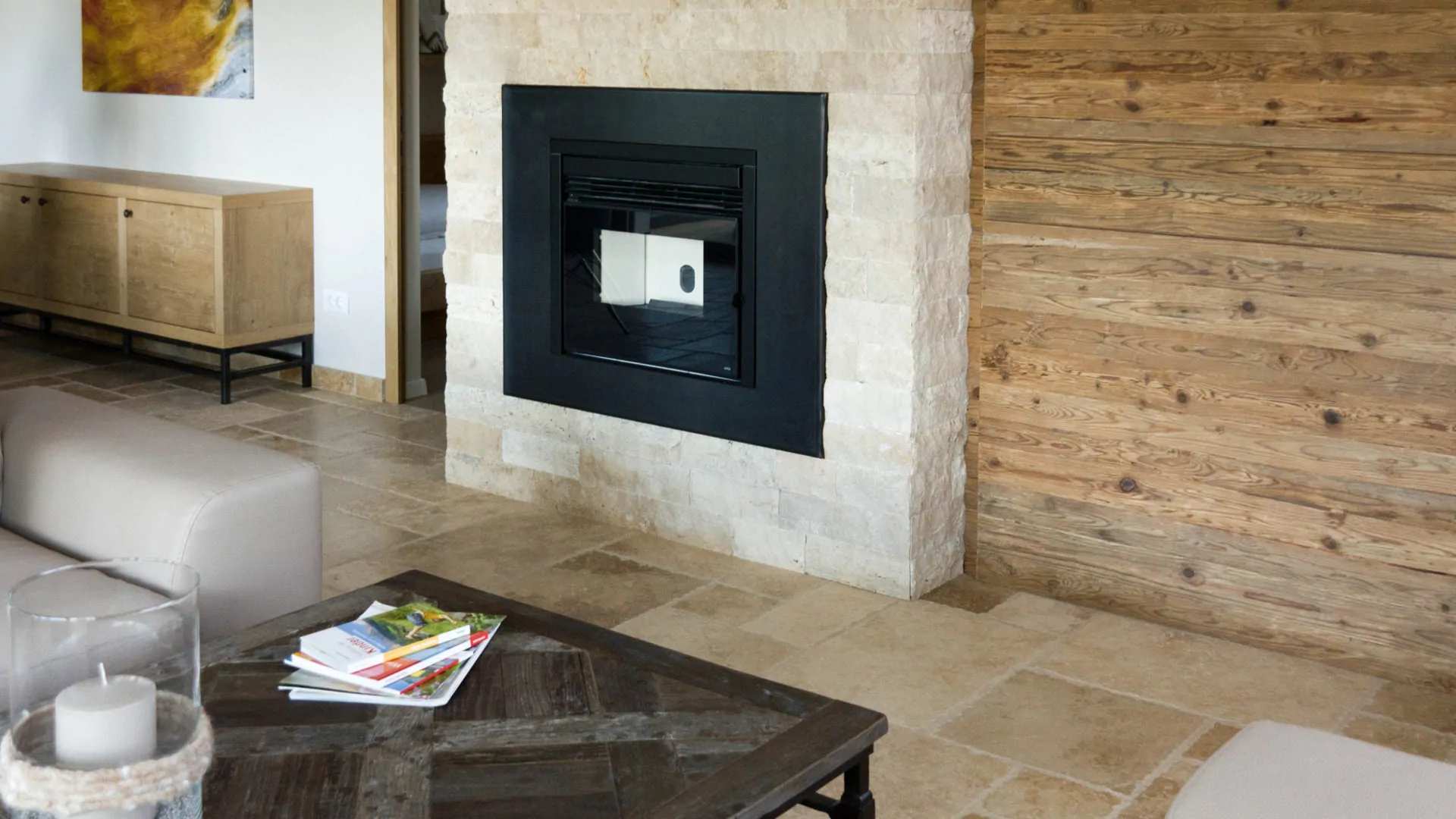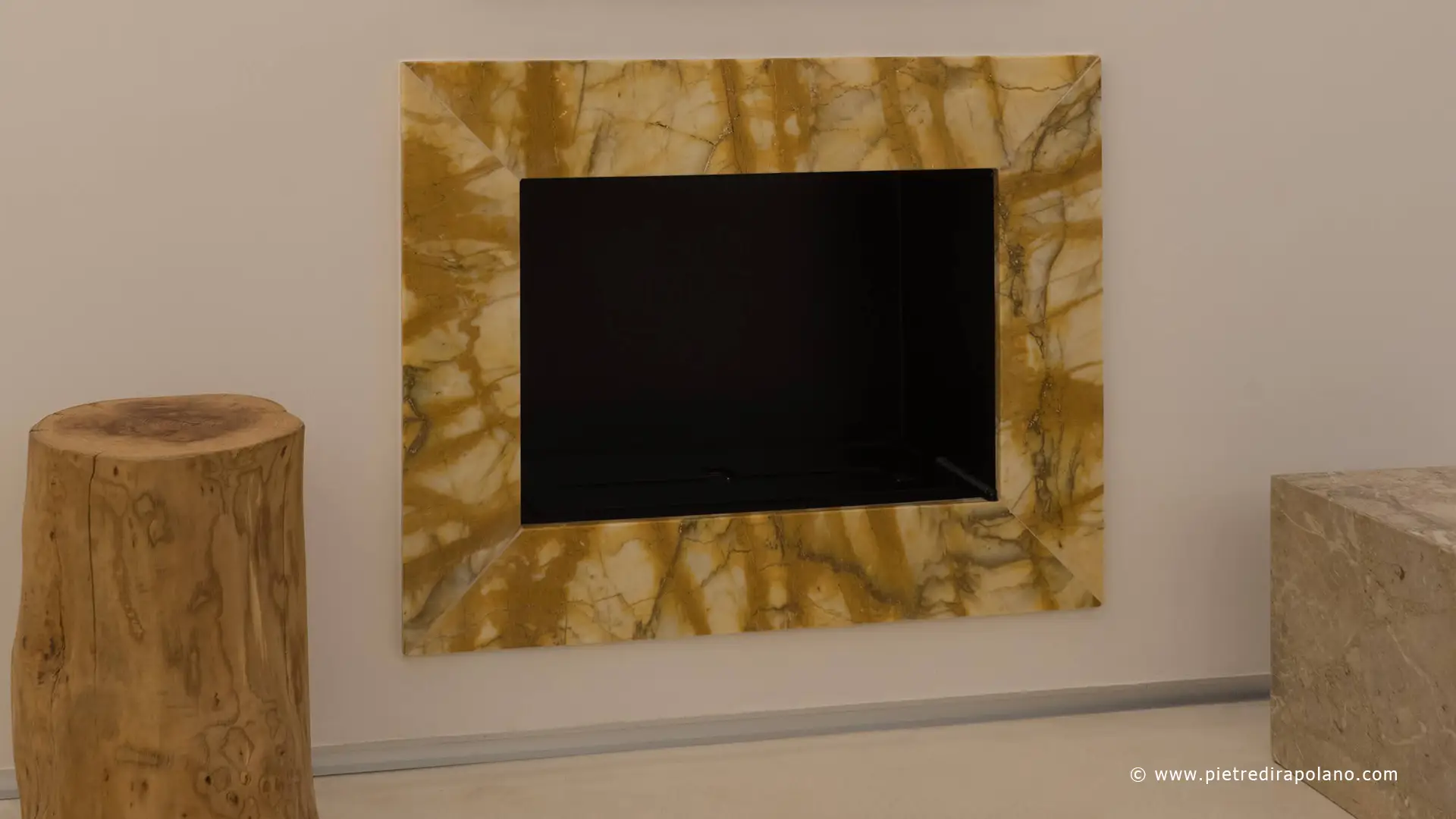 Per un ambiente moderno ci piace l’utilizzo della cornice per il camino dal design pulito, che lascia emergere le particolari venature e sfumature di colori naturali.